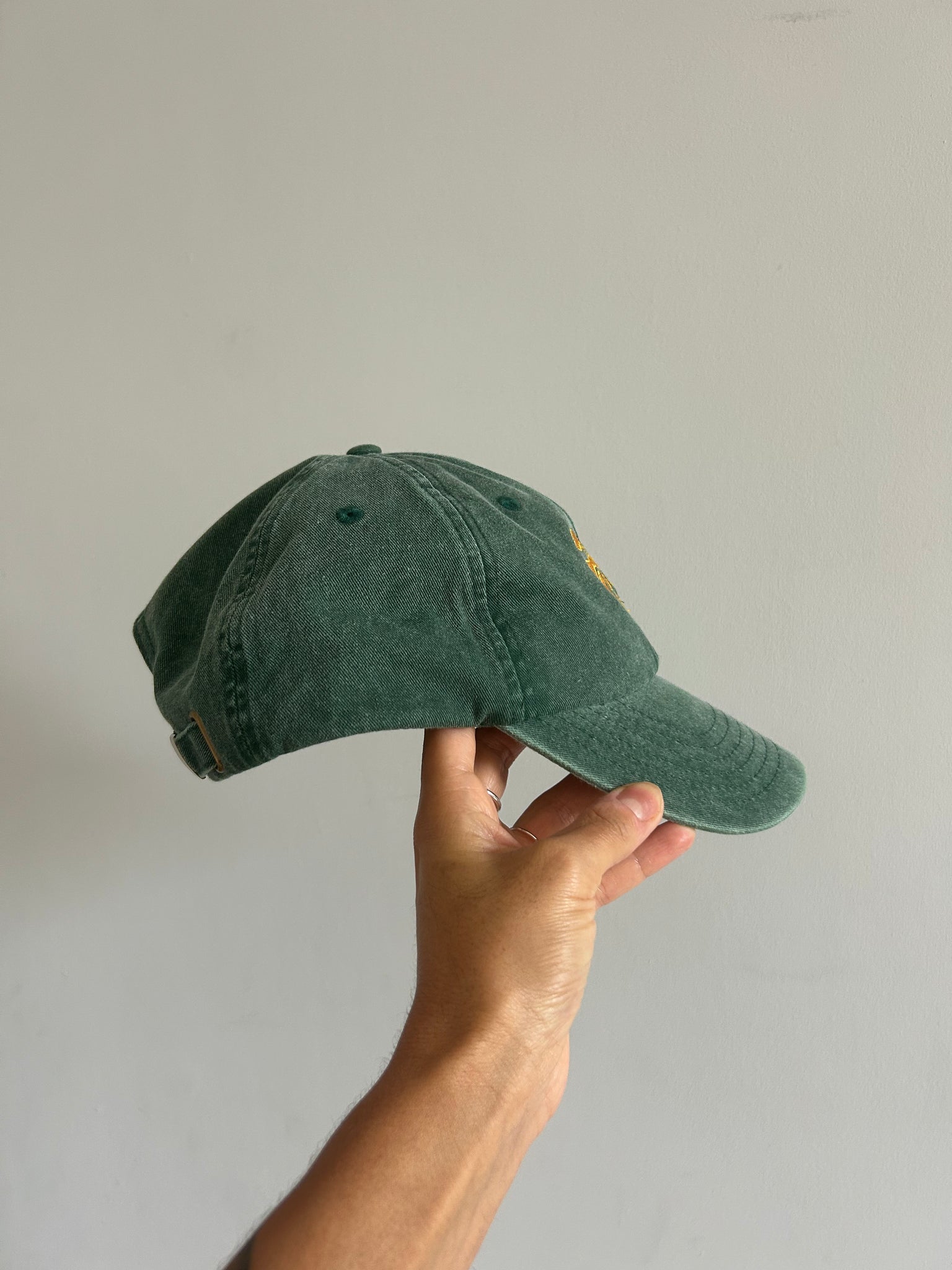 This vintage-style cap features a soft, unstructured crown for a relaxed fit and a pre-curved peak for effortless wear. Crafted from 100% heavy washed cotton, it offers both durability and comfort. The adjustable self-fabric strap with a brass-effect buckle ensures a customizable fit with a classic touch.